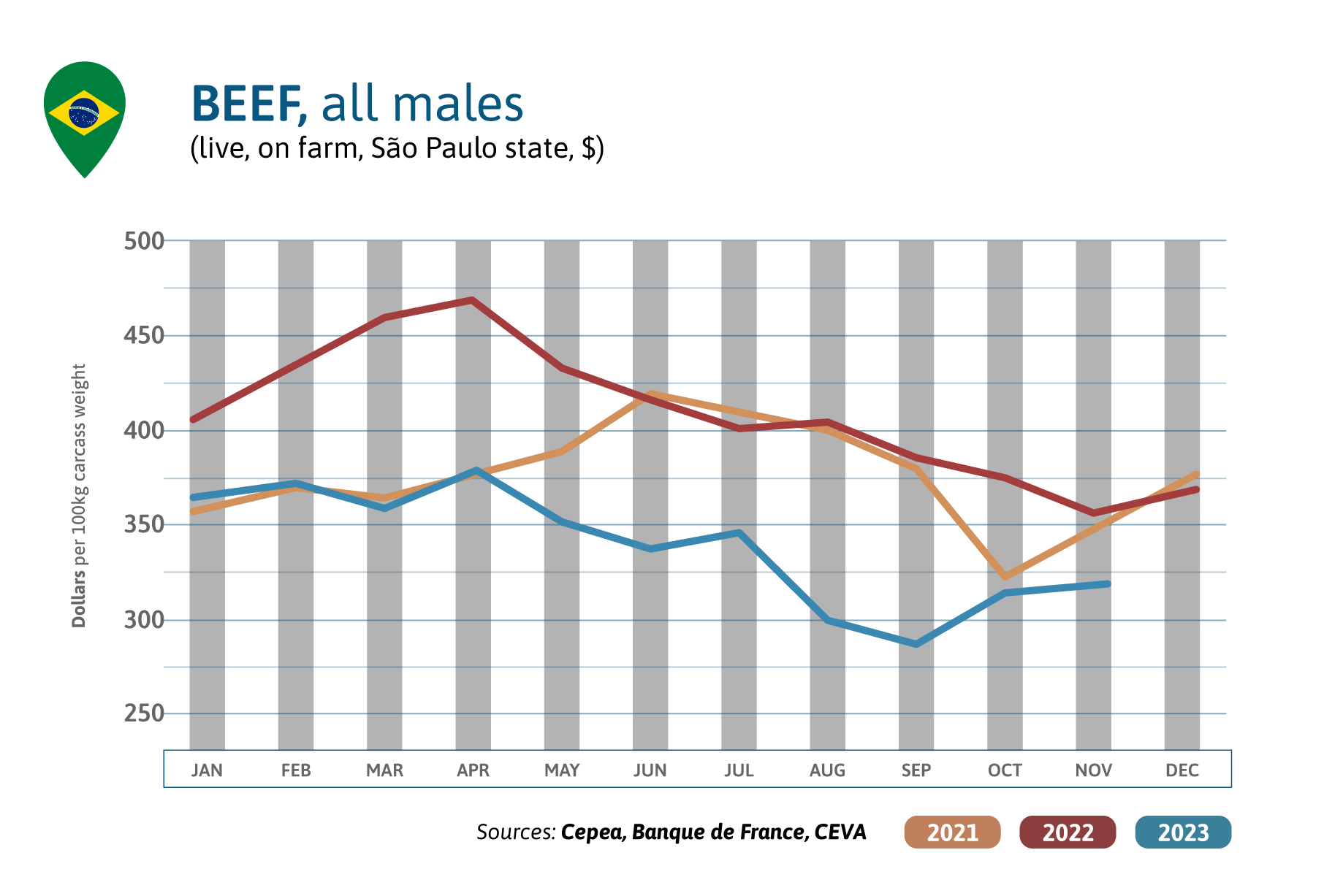 Beef quotations have been oscillating in 2023 but are still at lower levels compared to the year before with more animals ready to slaughter. According to IBGE between January and September 2023, beef production hit a record: 6.4 million tons were produced (+8% /2022 and +4.5% /2019, the previous record).