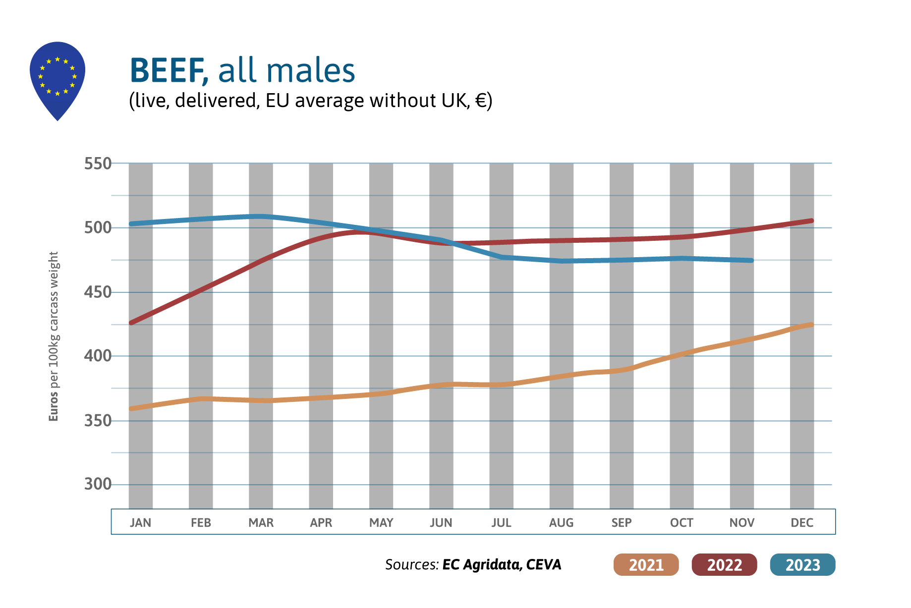 Demand for male beef has continued to increase before Christmas. So, prices for young males ready to slaughter was still increasing in November while prices for female remained under pressure.